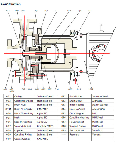 تُصنع المضخات باستخدام مواد بلاستيكية حرارية عالية المقاومة للميكانيكا والكيميائية، مثل GFRPP أو PVDF، وهي مناسبة لدرجات حرارة تتراوح بين 0 و120 درجة مئوية، حسب نوع المادة. أما الأجزاء غير البلاستيكية الملامسة للسائل المضخوخ، فتُصنع باستخدام مواد مقاومة للتآكل ممتازة، مثل سيراميك الألومينا عالي النقاء بنسبة 99.7% وGFRPTFE.
