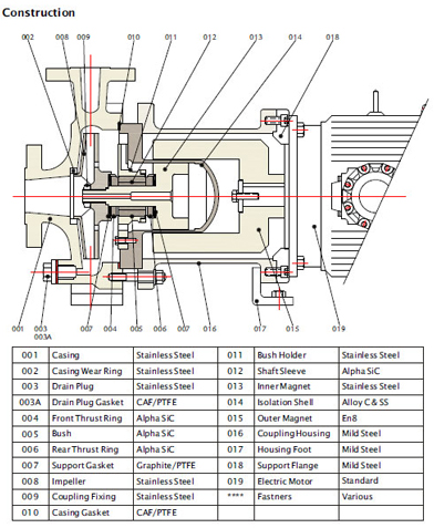 تُصنع المضخات باستخدام مواد بلاستيكية حرارية عالية المقاومة للميكانيكا والكيميائية، مثل GFRPP أو PVDF، وهي مناسبة لدرجات حرارة تتراوح بين 0 و120 درجة مئوية، حسب نوع المادة. أما الأجزاء غير البلاستيكية الملامسة للسائل المضخوخ، فتُصنع باستخدام مواد مقاومة للتآكل ممتازة، مثل سيراميك الألومينا عالي النقاء بنسبة 99.7% وGFRPTFE.